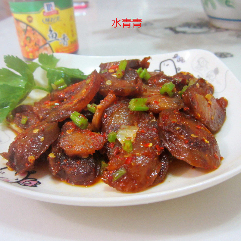 7:再倒入腊肠和葱丝翻炒。也可以倒入蒜苗炒,家常菜可以根据个人口味调整用料哈。