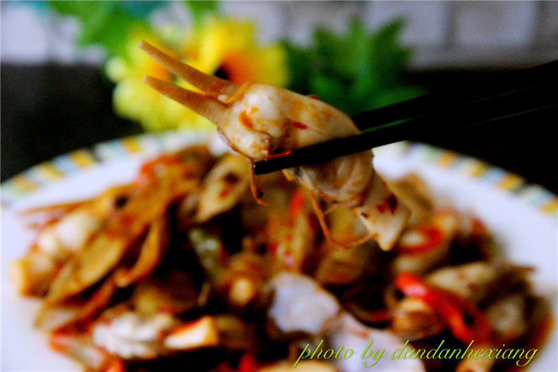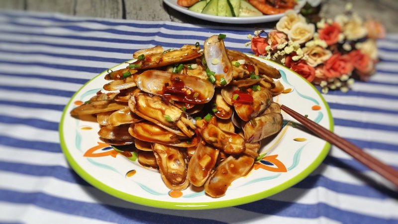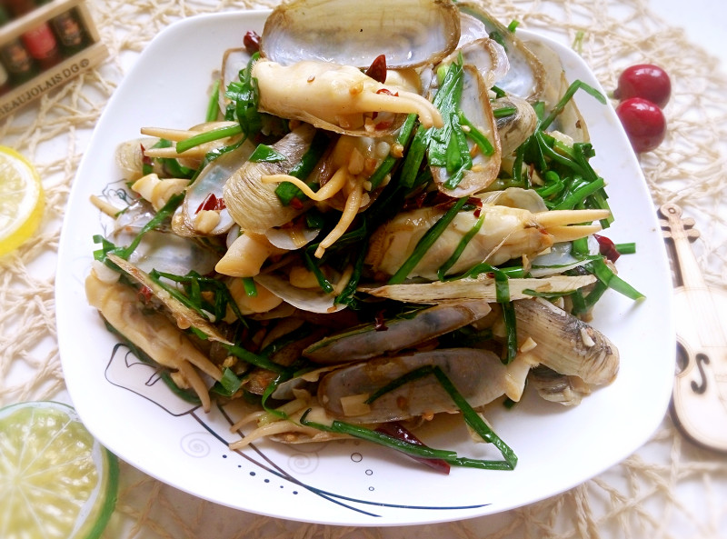 炒之前把蛏子泡在清水里,加点生抽和盐,吐尽泥沙,反复清洗干净。注意不要炒久了,肉质要保持鲜嫩。