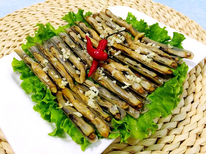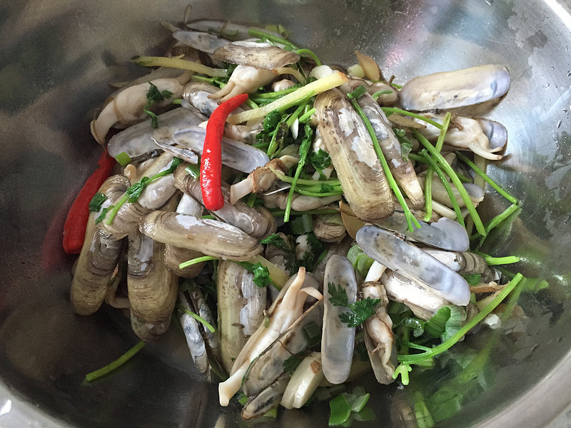 1:蛏子用水冲洗,加入水中几勺盐,放置2小时,让蛏子吐净沙子。