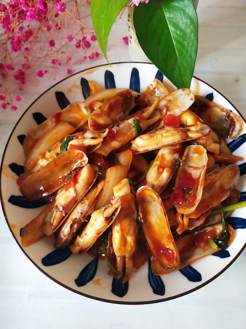 7:大火爆炒至蛏子开口即可,盛盘,肥美的蛏子就做好了!