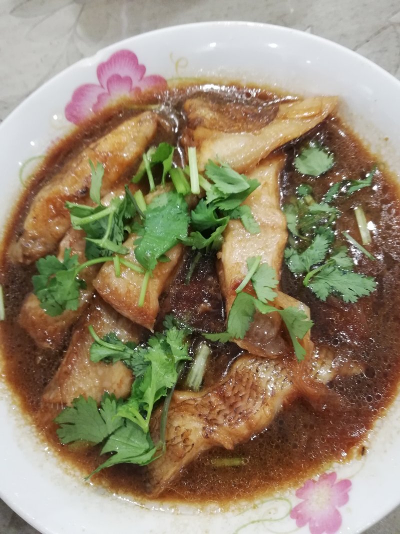 2:热锅放油,油热放入葱姜炒香后放入盐,然后倒入一小碗开水,水开放入生抽老抽耗油料酒蒸鱼豉油胡椒粉,然后倒入鱼,炖开了转小火五分钟,放入鸡精。