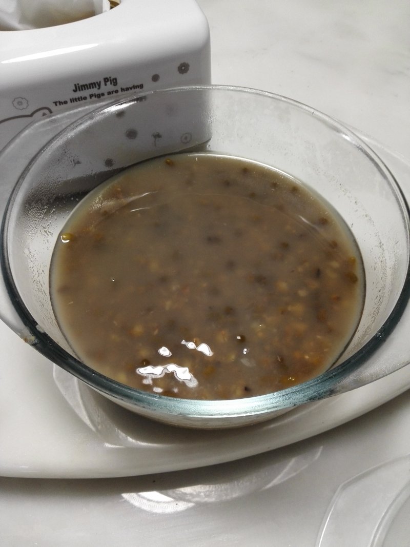 6:出锅,装杯,做热饮基本没有沫子,一杯绿豆沙,搭配杂粮饼,今日早餐,好吃还有营养。