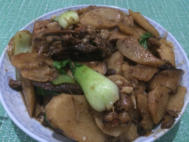 6:加入切丝的香菇,继续翻炒,待香菇变软,加入老抽提味儿,加入生抽上色,再加入醋,个人,喜好,可以不加;