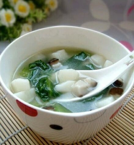 9:小火炖十几分钟后加入适量盐,继续炖,约五分钟,水基本上炖干,加入上海青,蒜末,翻炒,关火,调入香油,出锅!
