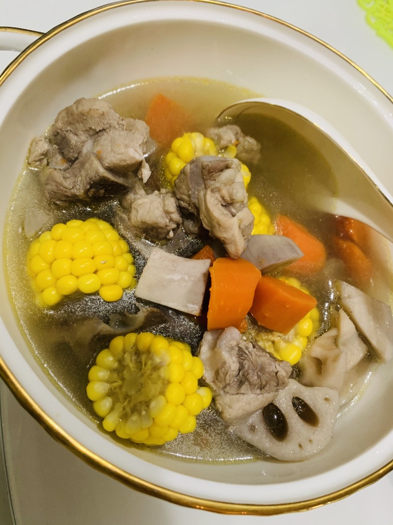Ps:几个小窍门:1、煲汤时入葱、姜、花椒和料酒可以去腥增香,不喜欢花椒也可以不放。2、排骨焯水时,冷水入锅可以更好地去除血沫,适用于炖汤;如果热水下锅焯水据说可以更好地锁住水份,肉质更嫩,适合红烧或炒菜。3、煲汤的水一次加够,中间实在要加水也要加热水。4、煲汤加入一点醋可使骨头中的钙、磷、铁等矿物质溶解出来,利于吸收。5、上述大部分窍门针对所有煲汤或红烧都有效。