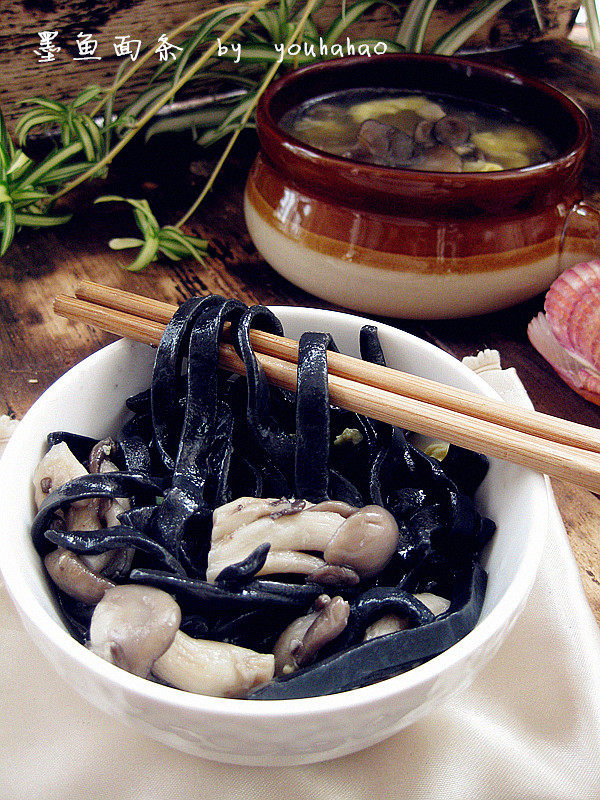 2:切条!拍一点蒜末!烧油,小炒一下加水,让鱿鱼煮一会儿就放面条!适量就好!面条熟了放盐!点点味精!葱花!