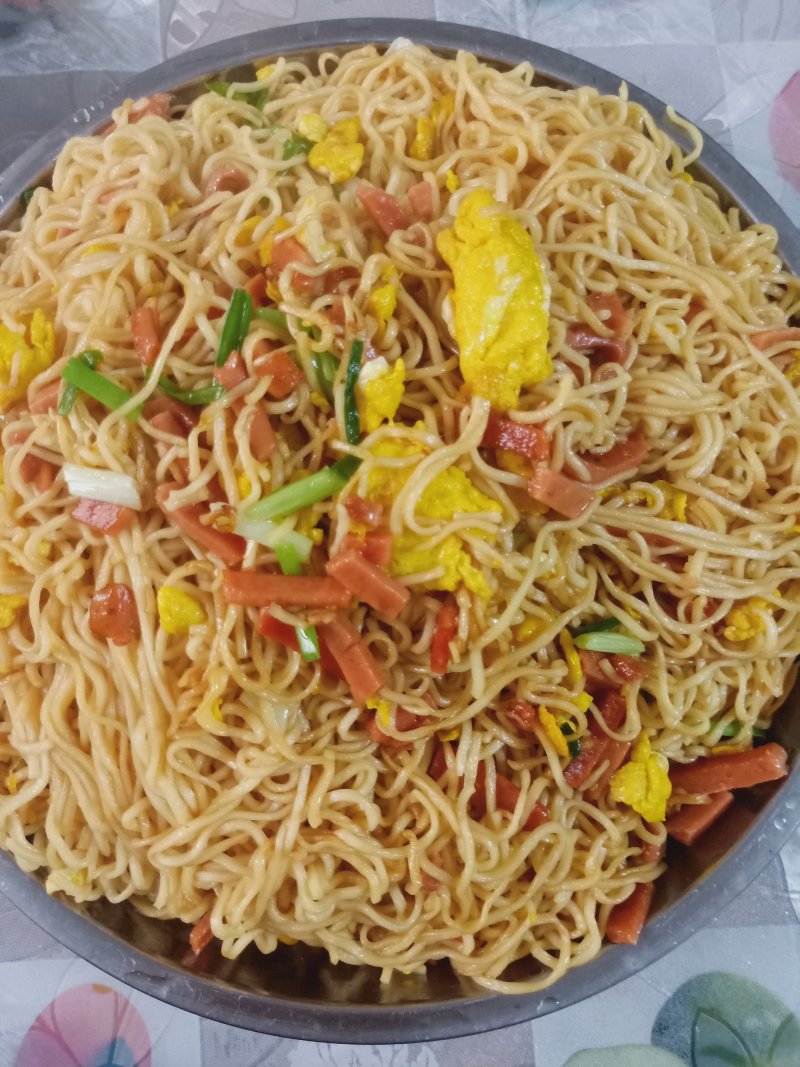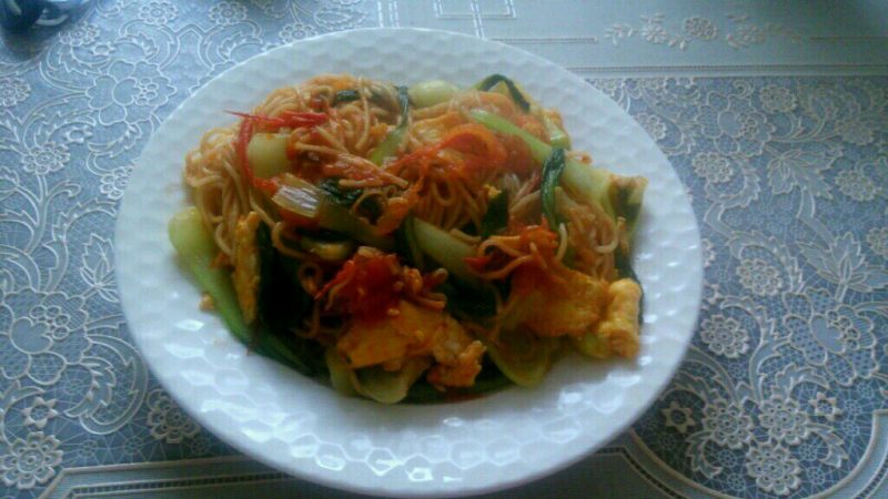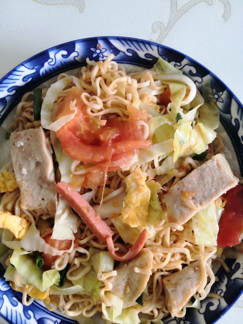 5:锅里放油把青菜火腿放锅翻炒几下加入鸡蛋在加面条。