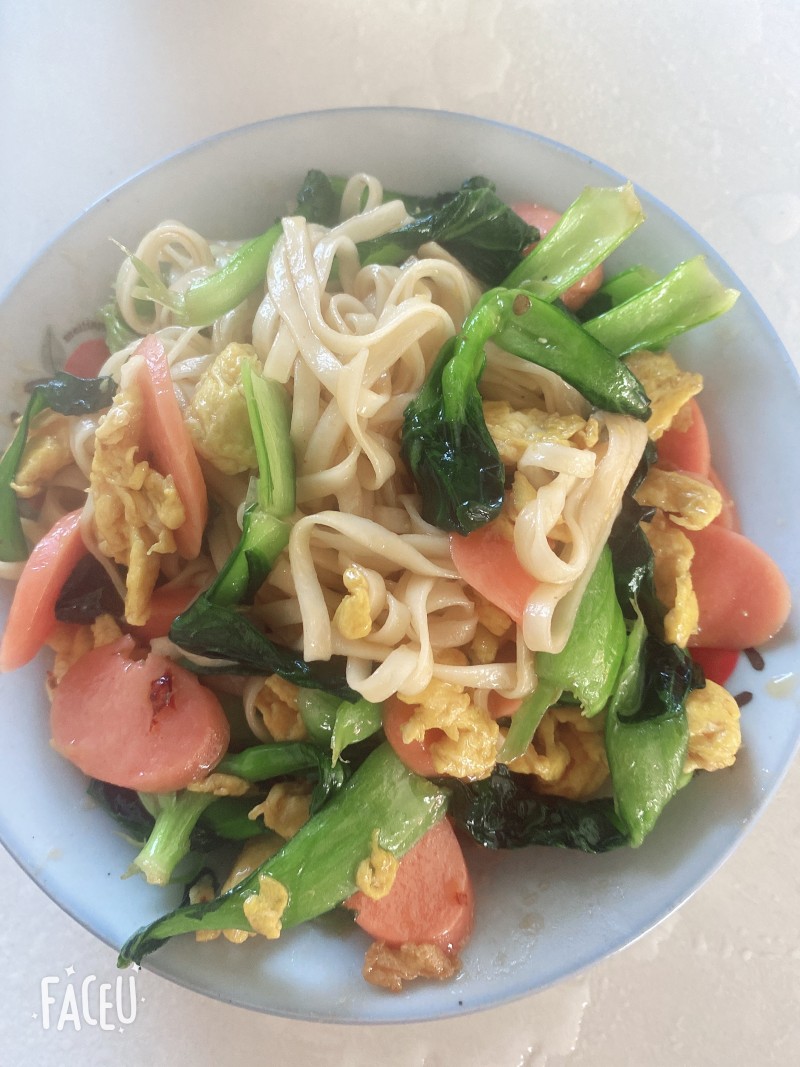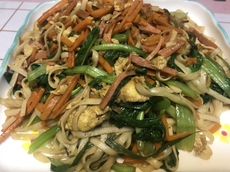 3:锅中油热将鸡蛋打散放入,煎至定型盛在碗中备用,再次往锅中倒入少许油,油热放入胡萝卜丝、大葱丝、火腿肠丝,翻炒至胡萝卜八分熟时加入小青菜,再放入所有的调料,一起炒至小青菜五分熟时加入提前煮好的面条(超市买的陈克明中宽面条,水开煮至9分熟捞起放入凉水中过一遍备用),继续翻炒至均匀即可出锅。
