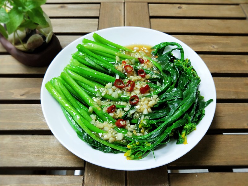 5:油烧热放入蒜蓉,蒜稍微变一点颜色时候淋在菜上即可,吃的时候均匀拌一下。