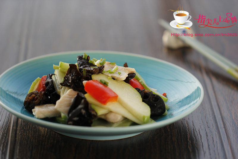 佛手瓜1个;里脊肉50克;红辣椒1个;黑木耳1小把;