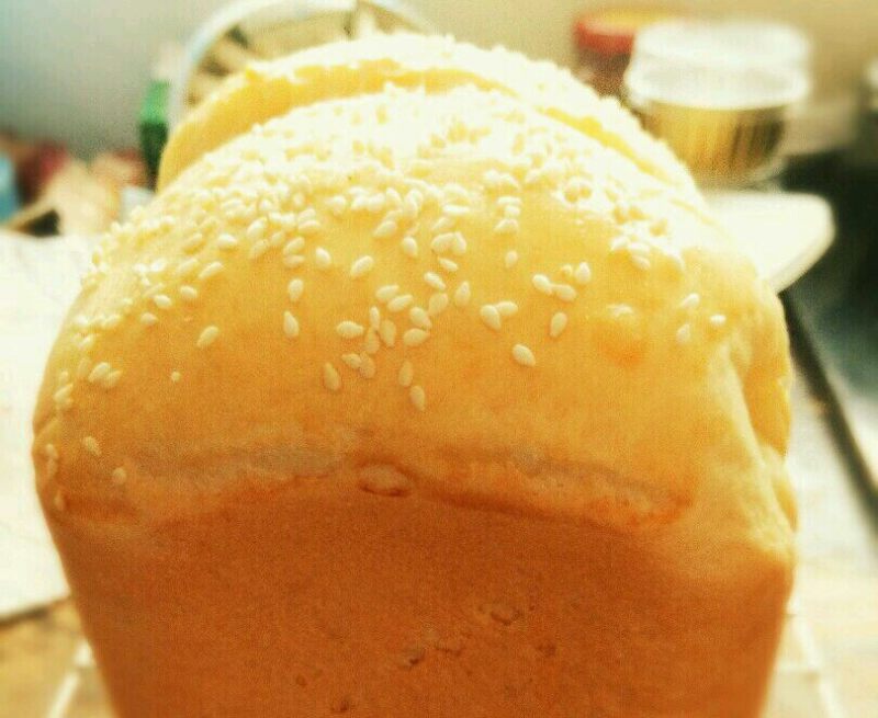 10:发好后刷些蛋液,洒上白芝麻。启动面包机烘烤,选浅色,烤一小时。