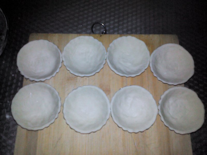 3:将挞液均分到八个挞皮中,七八分满就可以