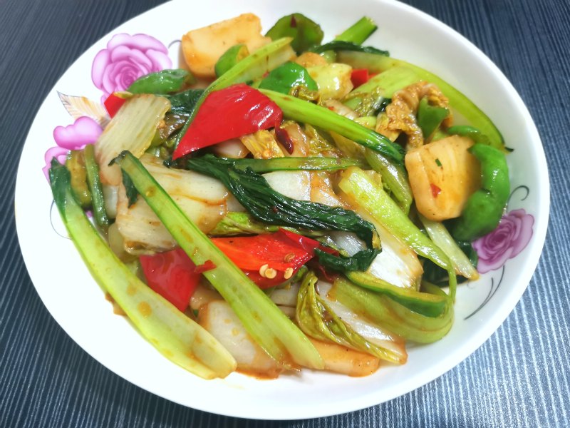 小油菜适量;娃娃菜适量;年糕适量;青椒适量;红椒适量;