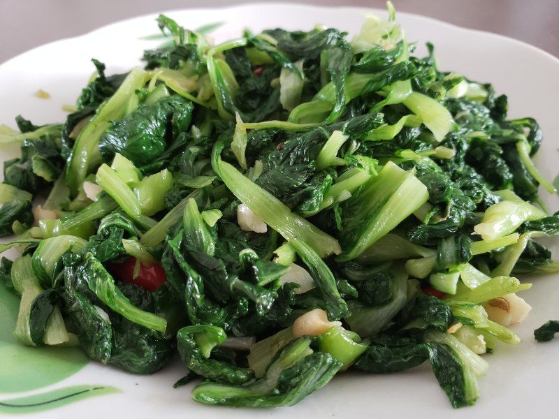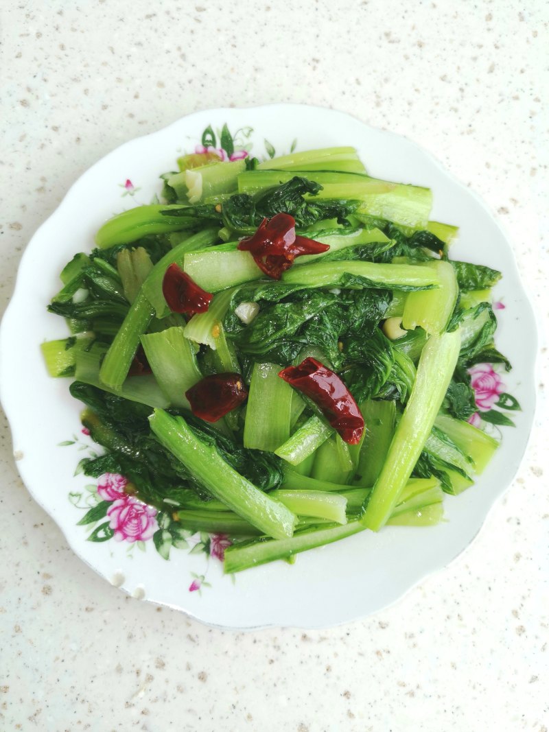 6:锅烧热放油,倒入葱、蒜和辣椒爆香,再倒入小青菜翻炒一下加盐调味即可。
