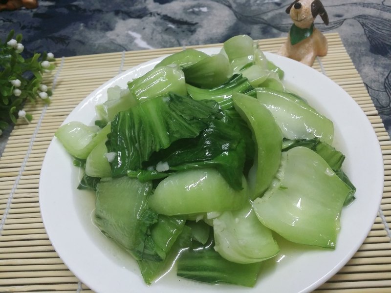 4:油下锅,等油温热把蒜末放入油中爆香,在把小白菜更先放入锅中炒,然后加入小白菜叶子、盐、味精一起翻炒均匀即可