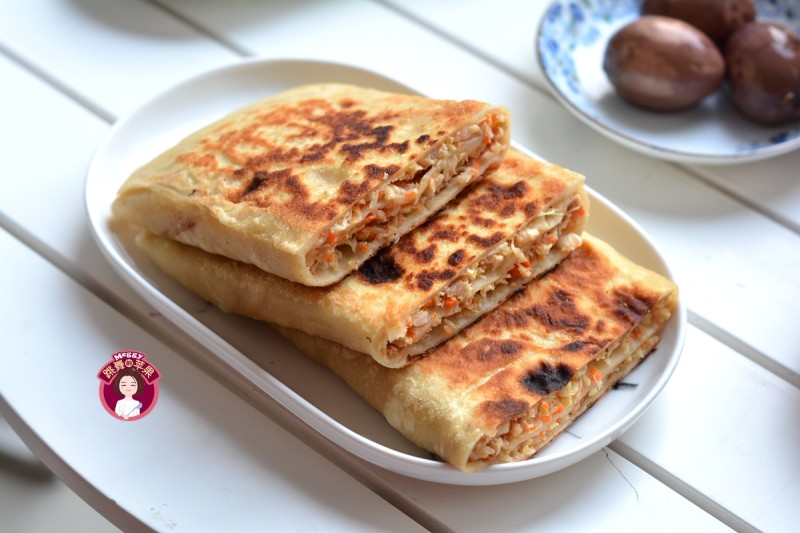 11:三层早餐饼,时间不用长,把豆浆或者稀粥都准备好,半个小时都用不了,轻松搞定一家四口的美味营养餐。