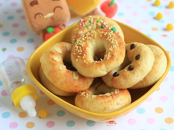 6:面粉圈上面刷鸡蛋黄和清,上面粘上其他配料。放入烤箱。