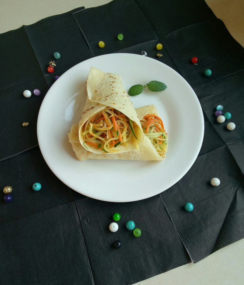 4:锅中放少许的油,加入胡萝卜丝,煸炒至五成熟加入土豆丝煸炒至全熟。再加入黄瓜丝和少许的盐,翻炒均匀,盛出备用。