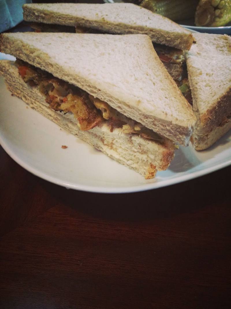 5:鸡蛋液里加点牛奶,盐,下油锅煎直两面金黄然后刷上咸酱或者加点蘑菇酱,番茄酱都行切成容易加进三明治的形状,夹好微波炉里热30秒让面包软些