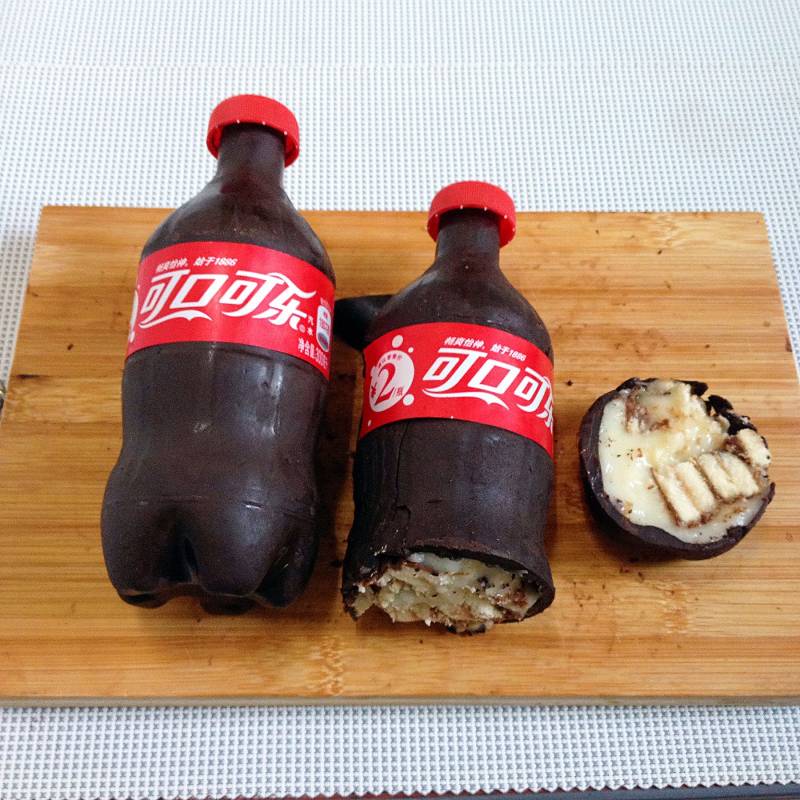 取出可乐瓶子时,务必要小心,别划到手,刀子别划到巧克力,以免影响美感。