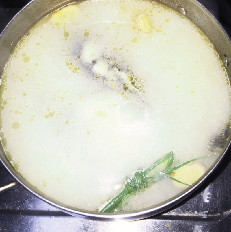3:加入开水,大火烧开转为小火熬20分钟,加入盐,白胡椒,姜片,葱继续熬10分钟