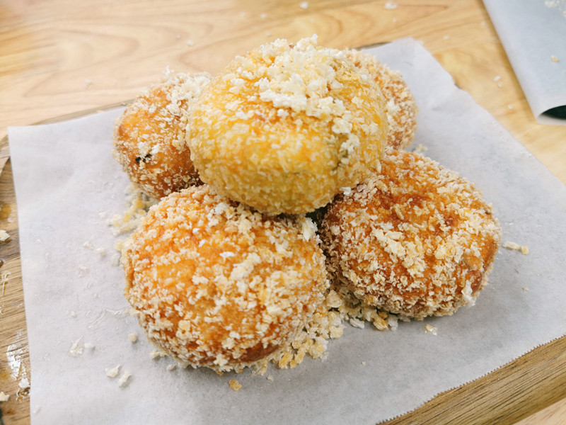 5:土豆泥搓圆放鸡蛋液里然后粘满面包糠压扁成圆形