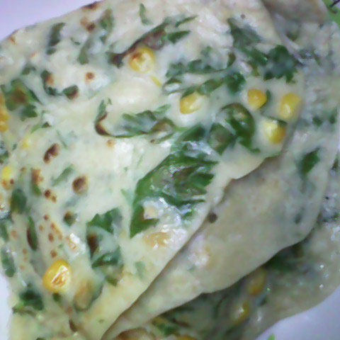 9:当锅边的面糊慢慢翘起,将蛋饼翻面,稍烙一会,即可出锅。