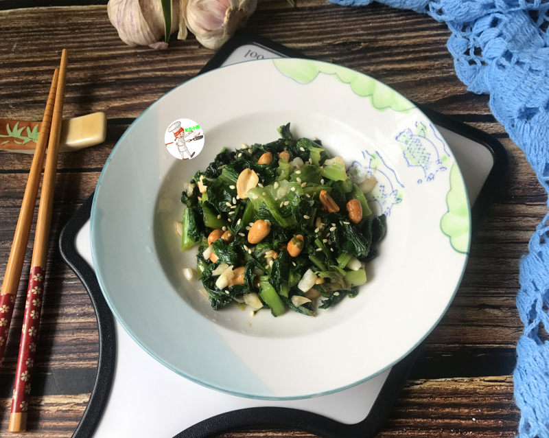 8:把调好的汁淋在莴笋叶上,再放上蒜末