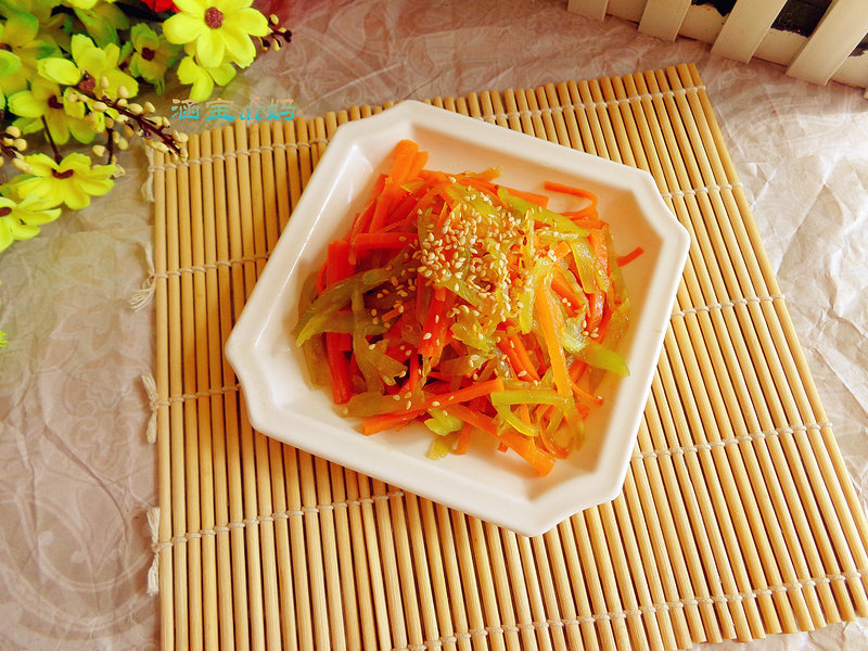 笋尖1根;胡萝卜半根;花椒适量;八角1个;醋适量;鲜酱油适量;植物油适量;芝麻适量;