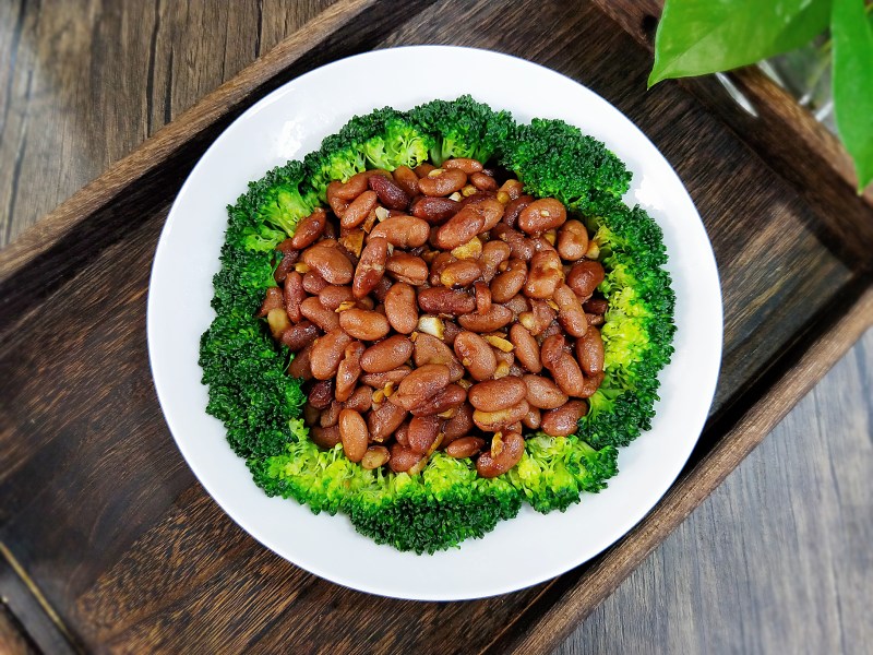 2:西兰花水开加盐煮一分钟沥干摆盘,锅中热油下蒜末炒香。