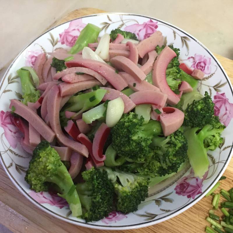 6:速炒放红肠,一起炒一下后,到点开水放盐稍微滚滚成盘。