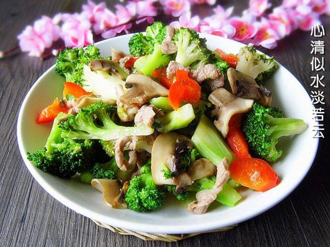 1:新鲜口蘑切片备用,西兰花掰成小朵洗净用盐水泡一下