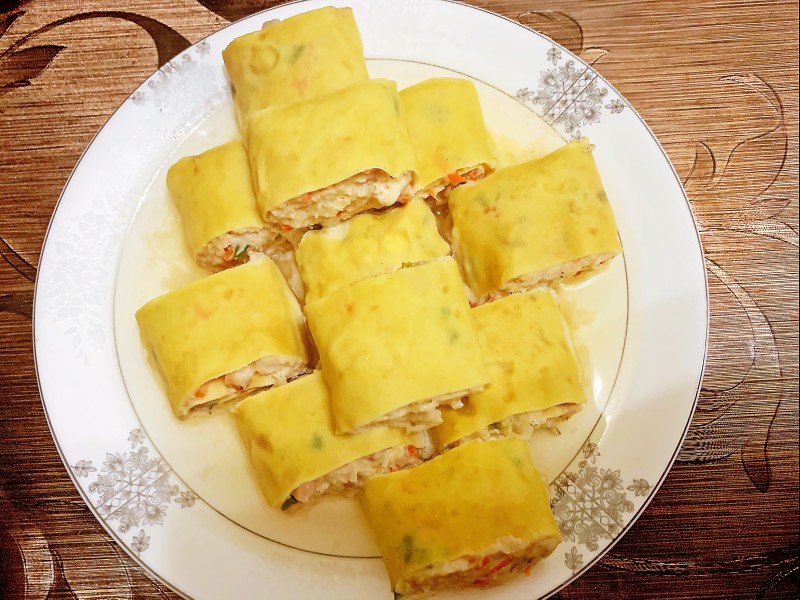 6:将蔬菜和鸡蛋皮放入千张中,从一边卷起来。