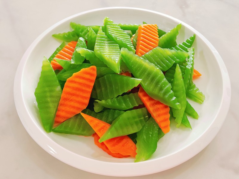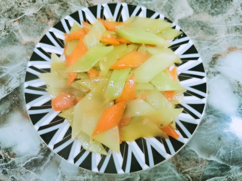 5:起锅烧油,放入莴笋胡萝卜,翻炒片刻放入1勺盐调味,再翻炒均匀即可。