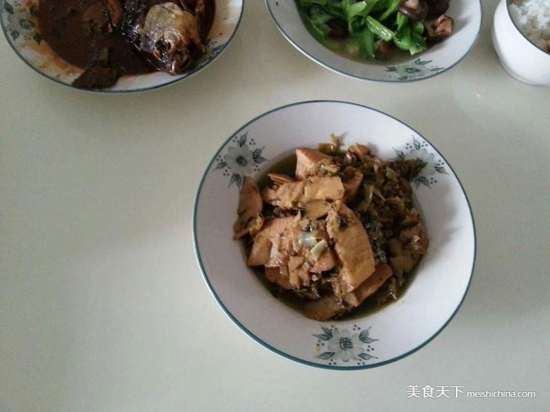 3:炒到笋看起来没水分了,颜色也变成黄色了。就可以倒入高压锅里,放入冬菜和白糖,菜籽油,加水没过笋继续烧,大概20分钟左右就好了