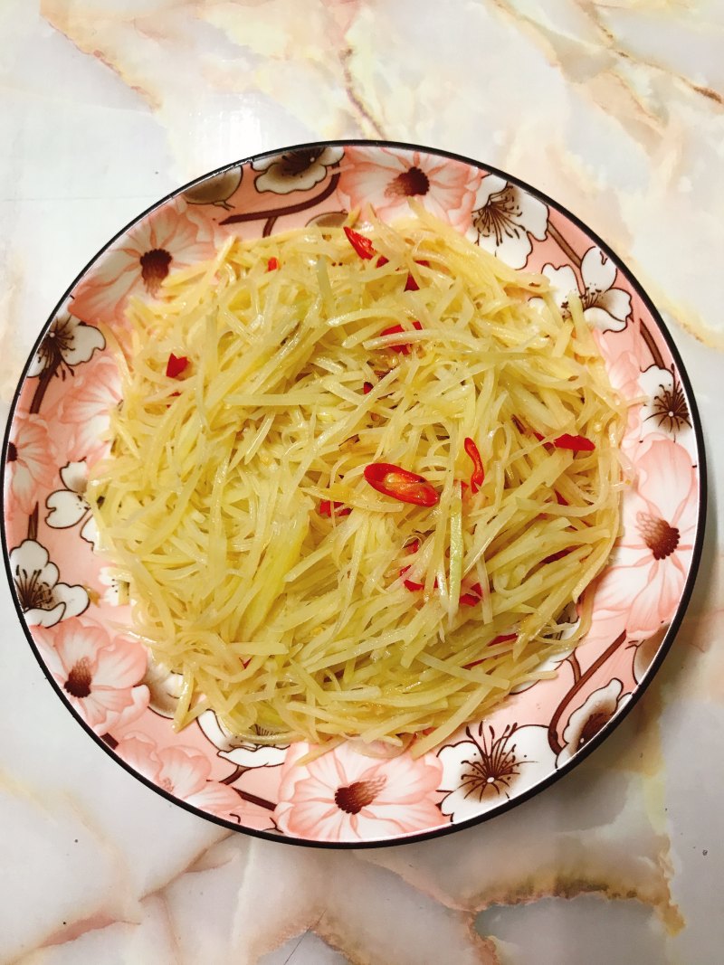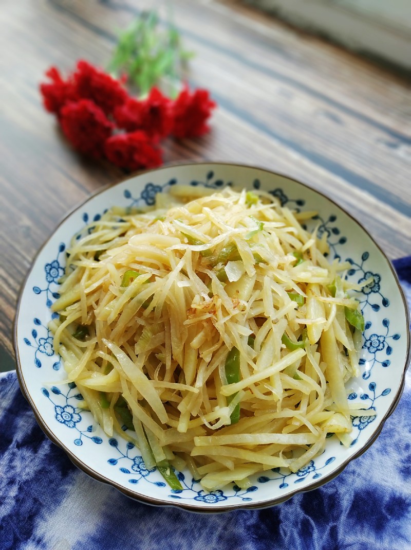 土豆丝切细一点比较容易炒熟,炒的时候不要太大火。用中火炒。我喜欢用最简单的食材做最简单的食物,不喜欢太复杂的搭配。