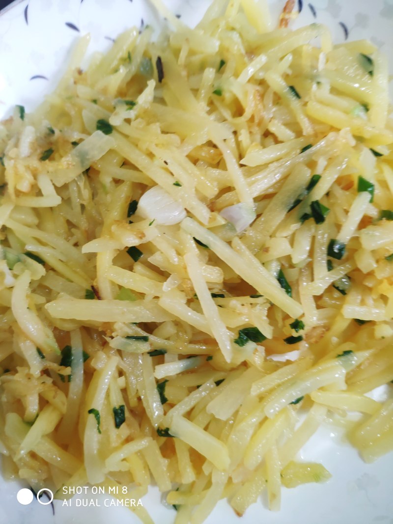 3:炒锅放油,放葱花,倒入土豆丝,加入醋,盐,鸡精,五香粉,翻炒均匀,炒透出锅。