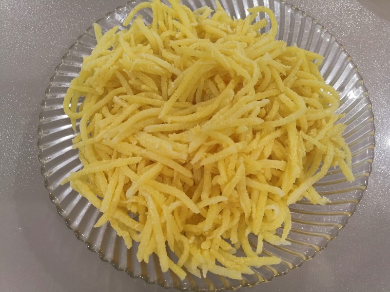 3:面粉和玉米面按1:1加入土豆丝,翻拌至每一根土豆丝上粘匀面粉。