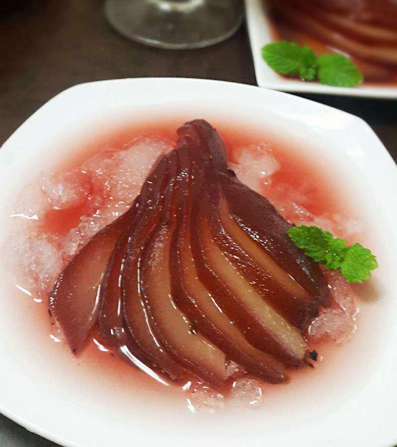 6:将冰沙堆在盘中然后放上红酒啤梨。因为经过冰镇后的红酒啤梨口感更好吃。