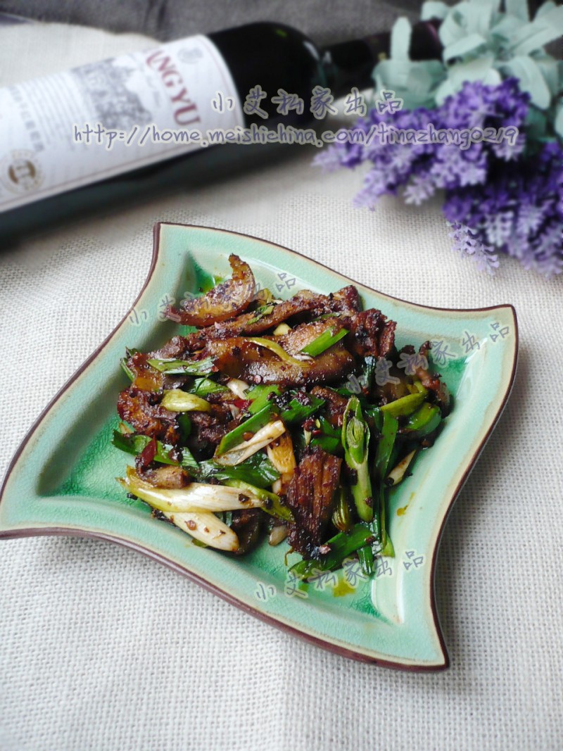 五花肉要多煸炒一会儿,一定要煸透。放入青蒜不要炒得太久,否则就不香了。