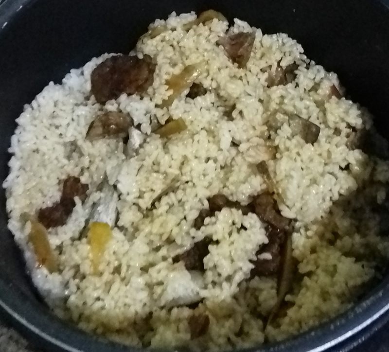 6:大米入电饭煲内胆中,将翻炒上色的排骨洋葱胡萝卜和汤同倒入锅中;洋葱在烹制过程中会渗出汤汁,所以焖饭的水要比平时焖白饭的少,同时还要算上炒排骨中的酱油汤的量;将排骨洋葱胡萝卜大米混合均匀,选用普通的焖饭程序就可以了;