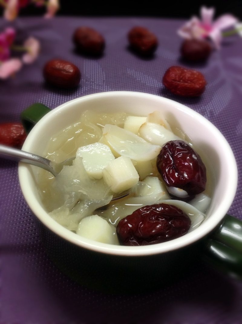 6:等银耳浓稠时放入山药、百合煮到山药酥烂即可