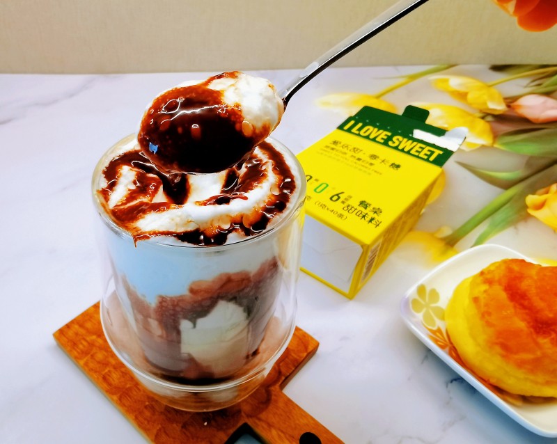 7:在棉花糖上面淋上巧克力酱,拌均,等棉花糖慢慢融化,就可享用。