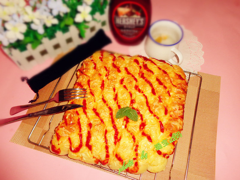高筋粉150克;低筋粉100克;黄油20克;马苏里拉碎50克;蛋液适量;牛奶100克;番茄酱适量;