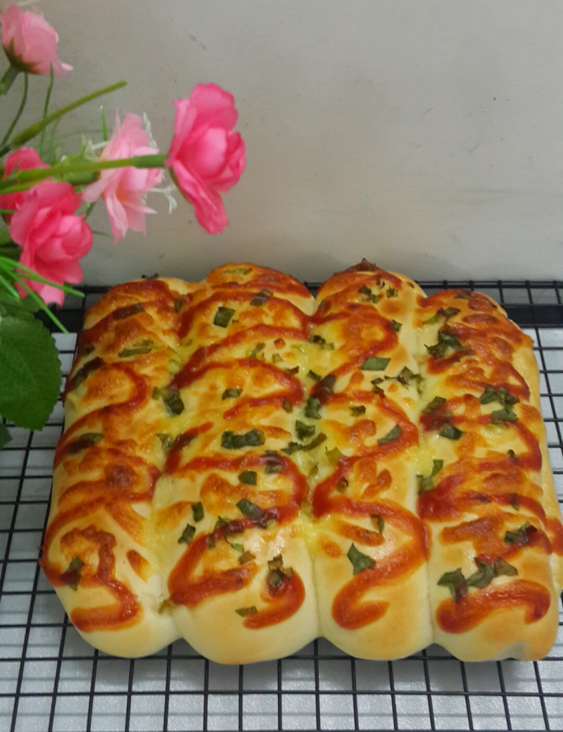 11:再撒一层葱花,挤上番茄酱,放入预热好的烤箱,中层,上下火170度烤20分钟(番茄酱忘记拍照了)