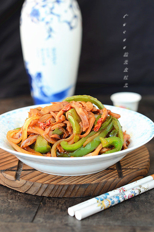 3:放入青椒丝煸炒