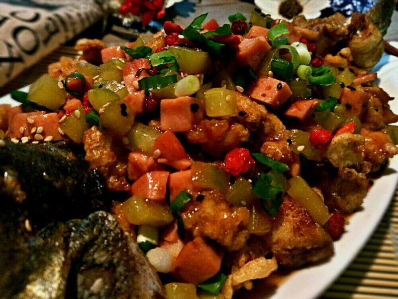 火腿适量;黄瓜适量;番茄酱2勺;淀粉2勺;鸡蛋2个;蒸鱼鼓油适量;味极鲜适量;盐适量;五香粉适量;葱适量;姜适量;糖适量;胡椒粉适量;