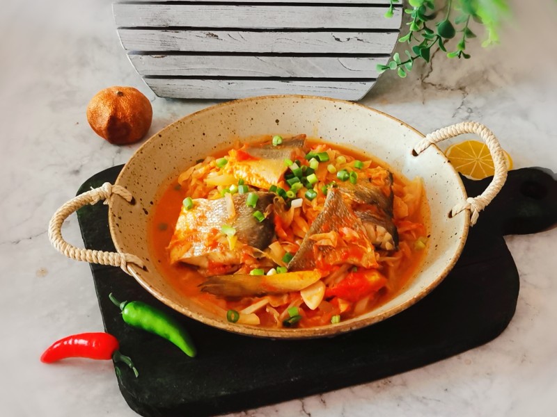 黄鱼1条;番茄500克;圆白菜半个;