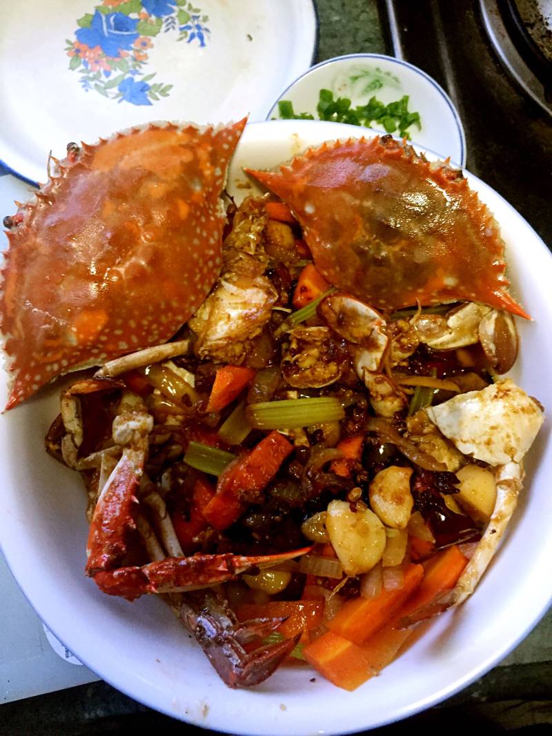 螃蟹6个;葱2棵;姜片3块;普通面粉50克;玉米油(用不完)50克;甜面酱1勺;味极鲜0.5勺;料酒0.5勺;香醋1/3勺;盐3克;白砂糖5克;黑胡椒粉1/2匙;清水150ml;