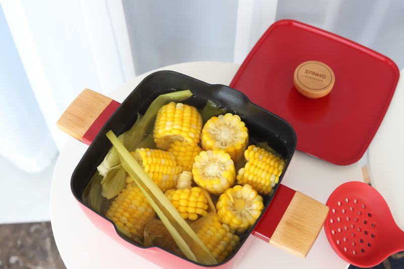 煮玉米的锅,我用的是三禾的双耳炖锅,这个锅是不粘材质的,锅体比较厚实,煮玉米还是用来煮别的汤都很好用,如果没有不粘锅,也可以选择砂锅,尽量不要用铁锅这样味道比较重的锅才好,不然会影响玉米的口感。